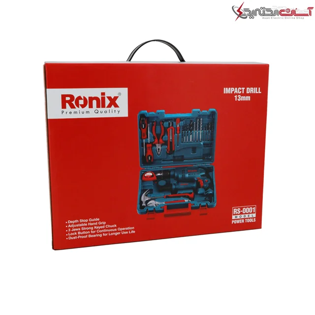 دریل چکشی RS-0001 رونیکس شامل کیت کاملی از انواع مختلف ابزارهای دستی به علاوه سری مته های رونیکس با سایز متفاوت است که در داخل کیف ضد ضربه BMC بسته بندی شده است. این دریل مجهز به موتور 650 واتی بسیار مقاوم برای بهترین کارایی در سوراخ کاری و دریل کاری چکشی می باشد که می تواند سرعتی بالغ بر 2800 دور در دقیقه ایجاد کند. سه نظام این دریل از نوع آچاری تمام فلزی و به ظرفیت 13 میلی متر است که برای تعویض نیازمند آچار مخصوص می باشد. از دیگر ویژگی های کیت دریل چکشی 13 میلی متری رونیکس می توان به برخورداری از دیمر کنترل سرعت و کلید چپ گرد و راستگرد اشاره کرد که امکان باز و بسته کردن پیچ را فراهم می کند. در ضمن مدل RS-0001 رونیکس از وزن سبک و طراحی ارگونومیک برخوردار است و گزینه ای مناسب برای سوراخ کاری سطوح مختلف چوب، فلز و بتن می باشد.