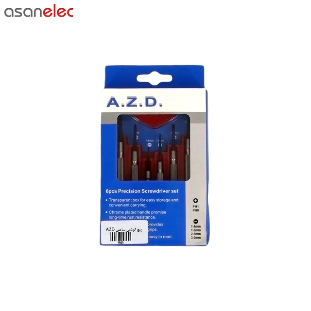 پیچ گوشتی از پرکاربردترین ابزارها در صنعت است. این ابزار در ابعاد و اندازههای گوناگون و برای کاربردهای مختلف تولید میشود. افرادی که تعمیرات تلفن همراه یا ساعت انجام میدهند، باید از پیچگوشتیهای بسیار کوچک استفاده کنند که با نام پیچ گوشتی ساعتی معروف هستند. کوچک شدن پیچگوشتی باعث کم شدن قدرت و افزایش دقت آن میشود. مجموعه 6 عددی پیچ گوشتی ساعتی «AZD» «ای زد دی» برای انجام کارهای ظریف و دقیق تولید شده است. این مجموعه 6 تایی شامل 4 عدد پیچ گوشتی دو سو و 2 عدد پیچ گوشتی چهارسو است. جنس سری این پیچ گوشتیها از فولاد بوده که باعث استحکام و مقاومت بالای آنها میشود؛ همچنین جنس دسته پیچ گوشتیها از فلز است. وزن بستهبندی این محصول 180 گرم است. این ست مجموعهای کامل از پیچگوشتی ساعتی محسوب میشود که با داشتن آن میتوانید از وجود چند پیچگوشتی با ابعاد مختلف بهره ببرید.
